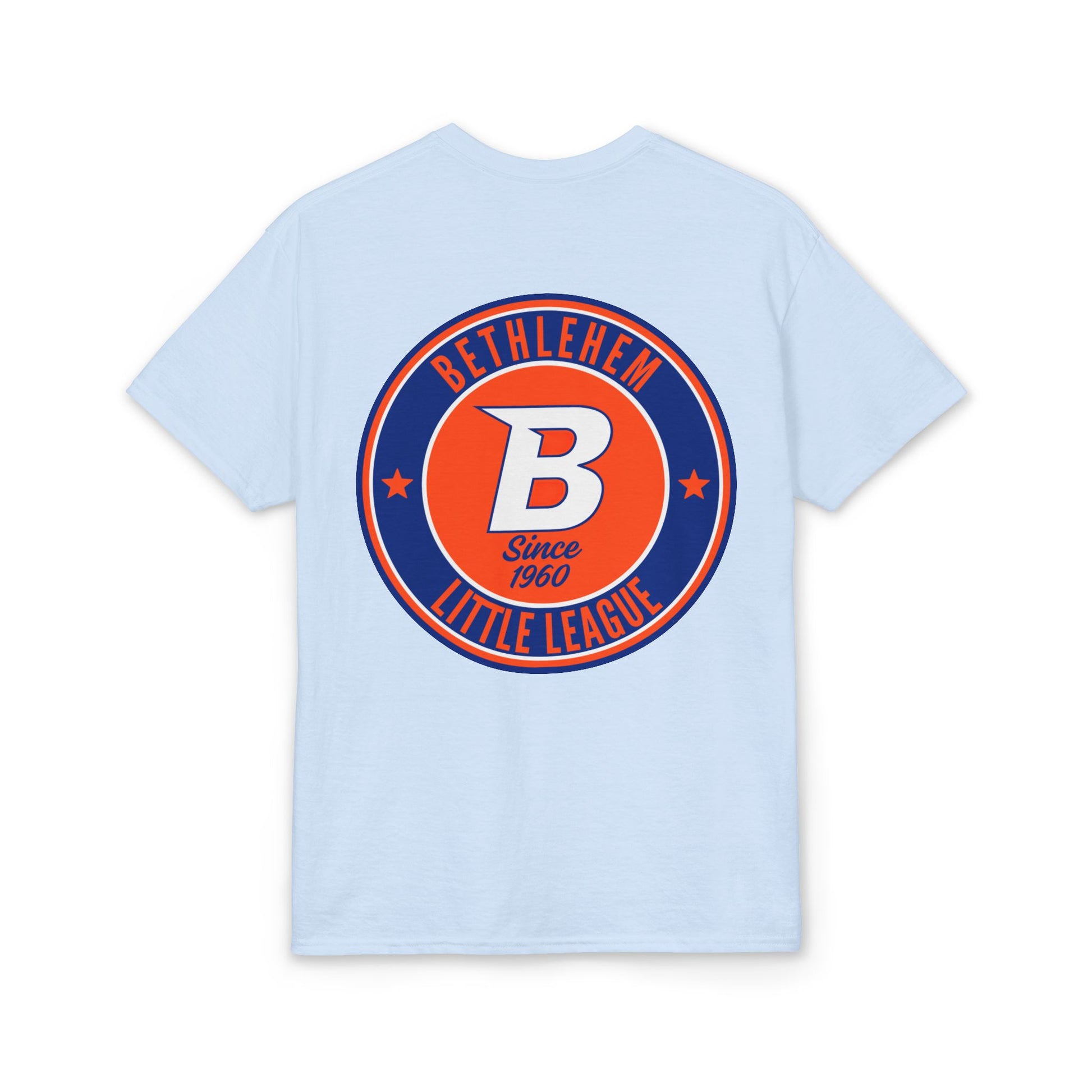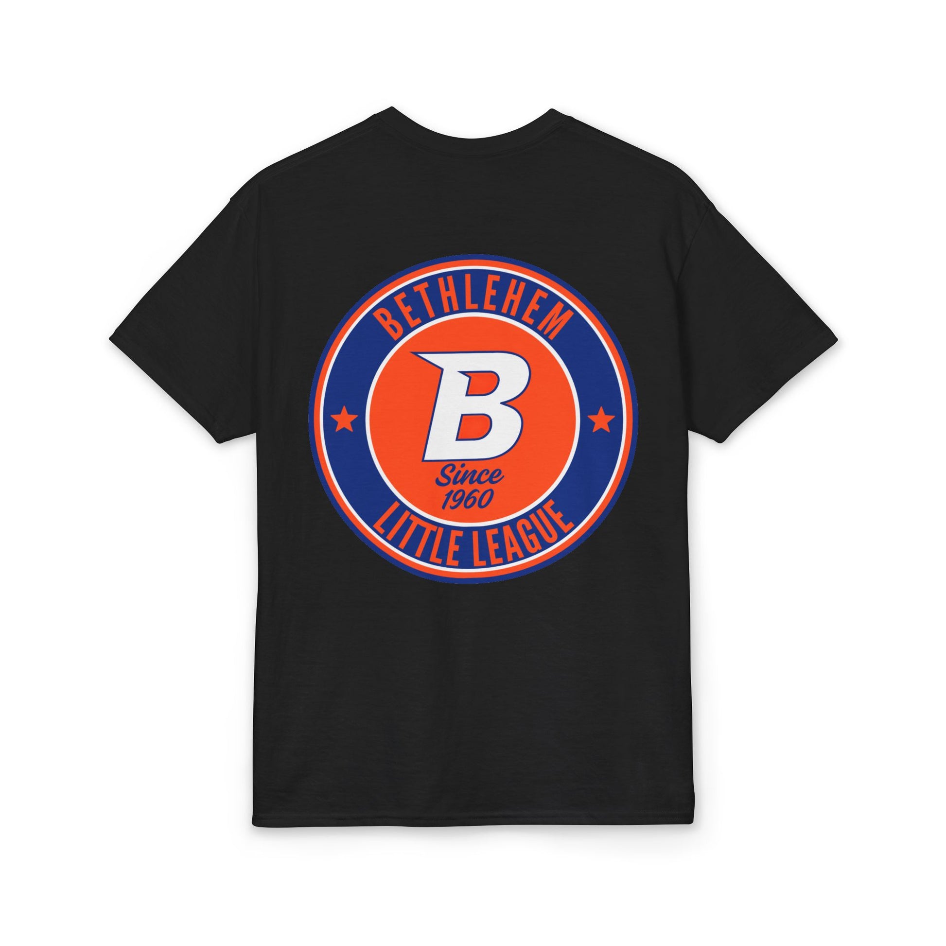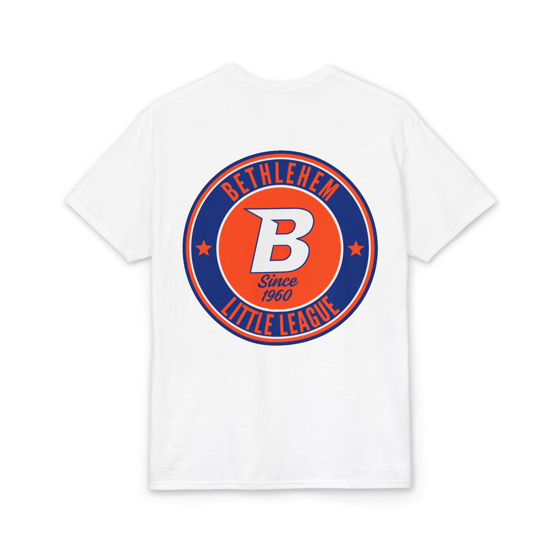 This white tee carries hometown pride with a playful, vintage little-league vibe. A small pocket-area flag on the front hints at Americana, while the back features a bold circular emblem that reads “Bethlehem Little League” with a confident “B” at its center. The colors — deep navy and bright orange — pop against clean white cotton-blend fabric, giving a sporty, sun-worn look that feels both nostalgic and ready for the field. Wear it to practices, local games, or neighborhood barbecues; it sits comfortably through warm afternoons and keeps you looking like you belong in the dugout.