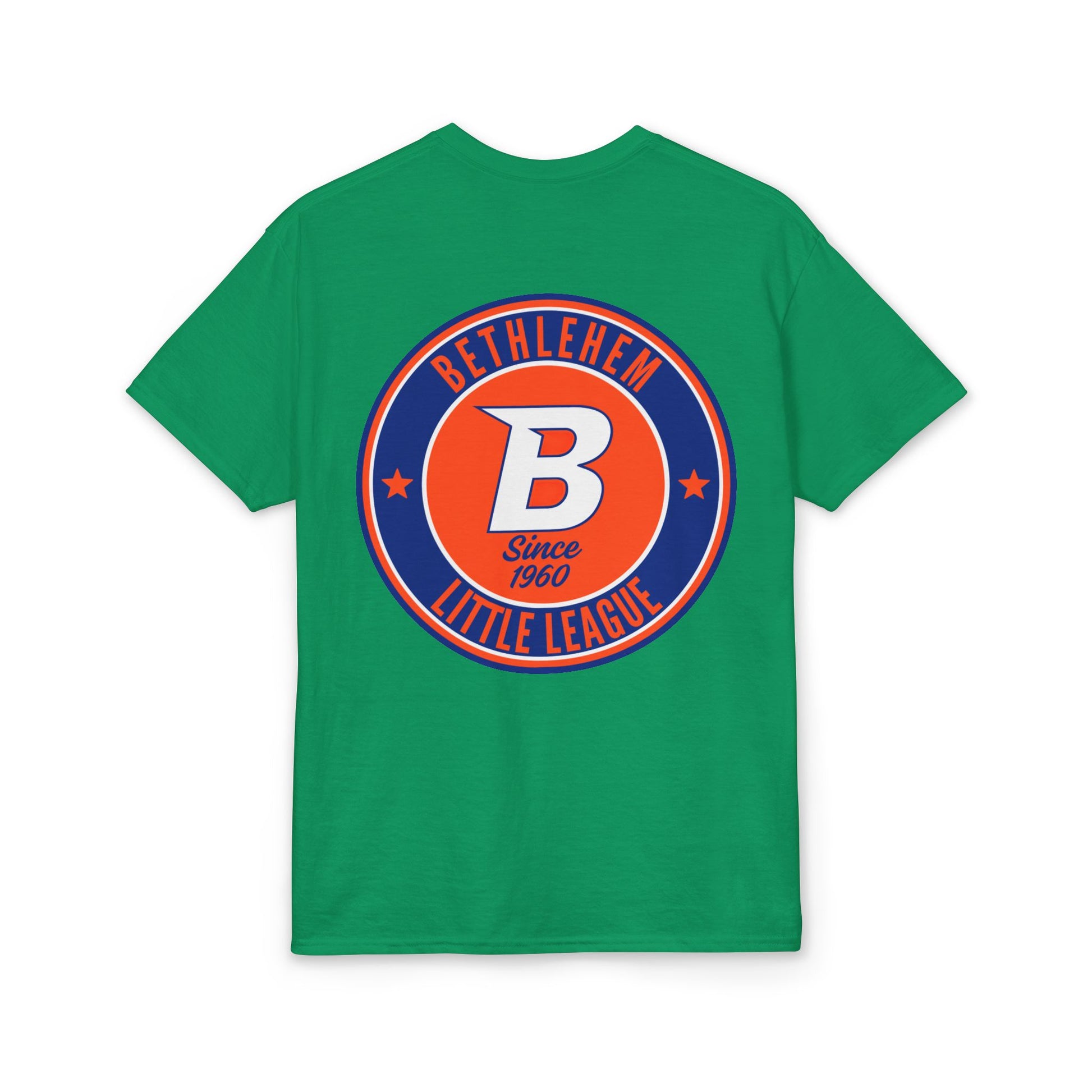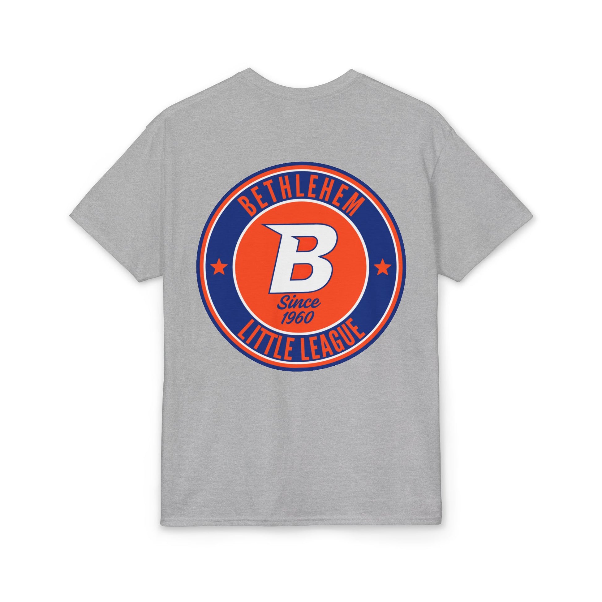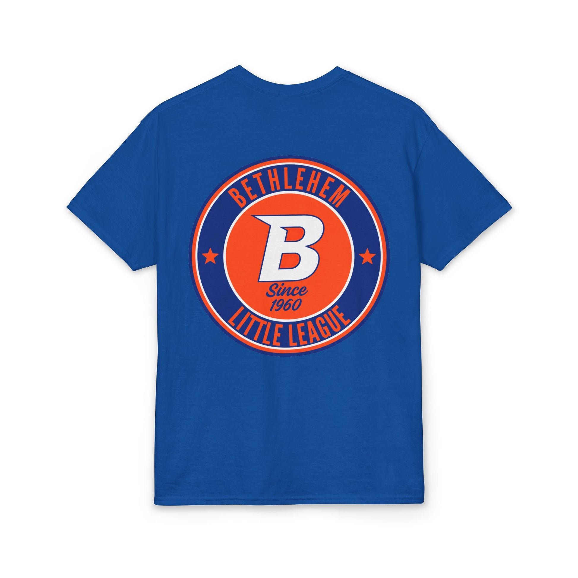 This white tee carries hometown pride with a playful, vintage little-league vibe. A small pocket-area flag on the front hints at Americana, while the back features a bold circular emblem that reads “Bethlehem Little League” with a confident “B” at its center. The colors — deep navy and bright orange — pop against clean white cotton-blend fabric, giving a sporty, sun-worn look that feels both nostalgic and ready for the field. Wear it to practices, local games, or neighborhood barbecues; it sits comfortably through warm afternoons and keeps you looking like you belong in the dugout.